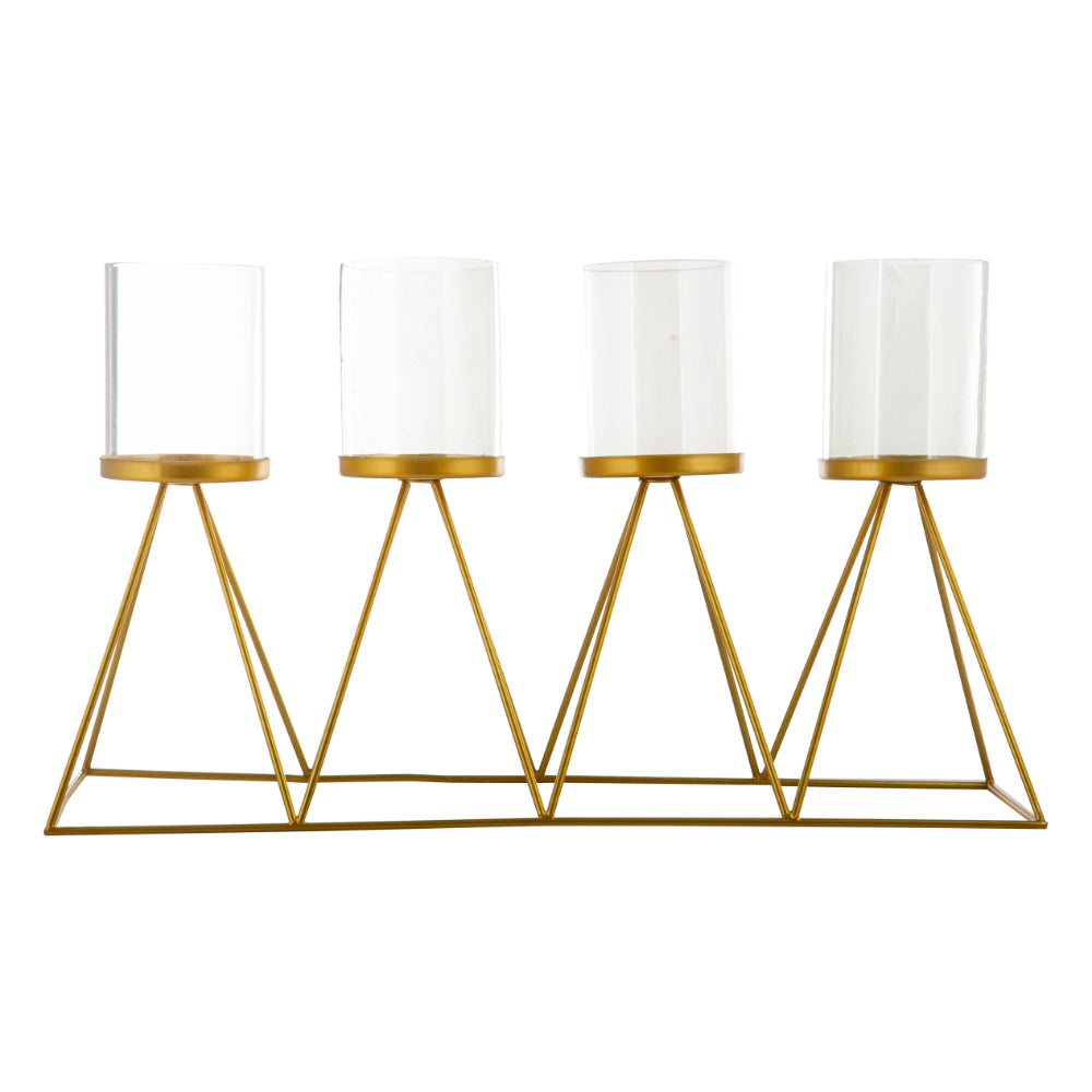This gold color iron pyramid shaped candle holder is designed to complement your candles. It comes with 5 glass covers to accentuate lighting of your candles. We enlist a variety of candle holders that you can pick based on your preference in sizes, designs and patterns, colors, and materials. Skillfully handcrafted master-piece has an exquisite design and polished by expert artisans giving it an unique and chic look. Candles of size 2*2 cm can be used. This is a handcrafted product and may have slight irregularities which only add to the charm of the finished product. We recommend dusting with a soft dry cloth. Do not use abrasive cleaner. Do not leave spills unattended.