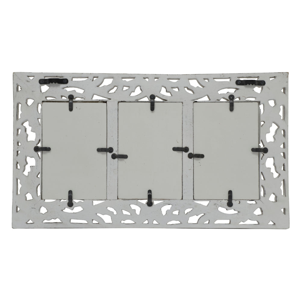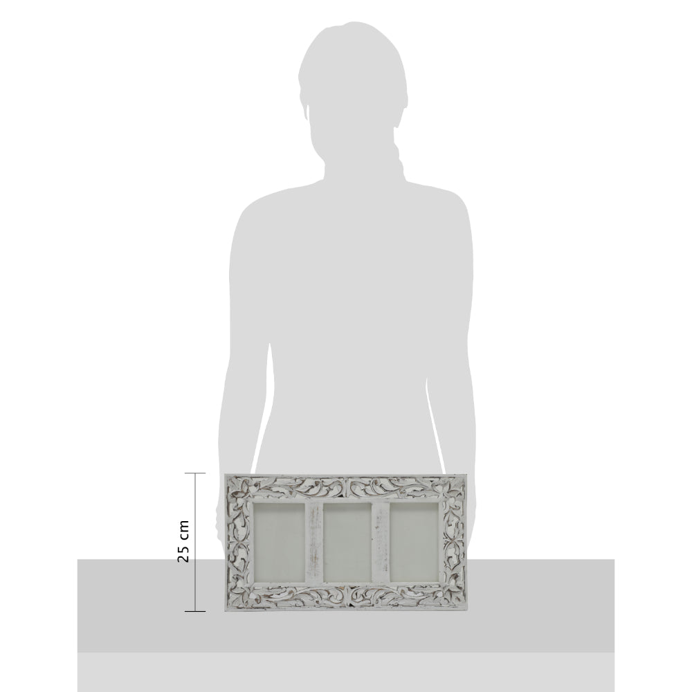 Our intricately carved mango wood picture frames feature an eye-catching foliage design to really show off any special photo. This white colored wood carved photo frame with black golden foil effect has been designed to hold three photos of 4*6 inch size. All our beautiful frames are made from mango wood, one of the most sustainable woods known to man.