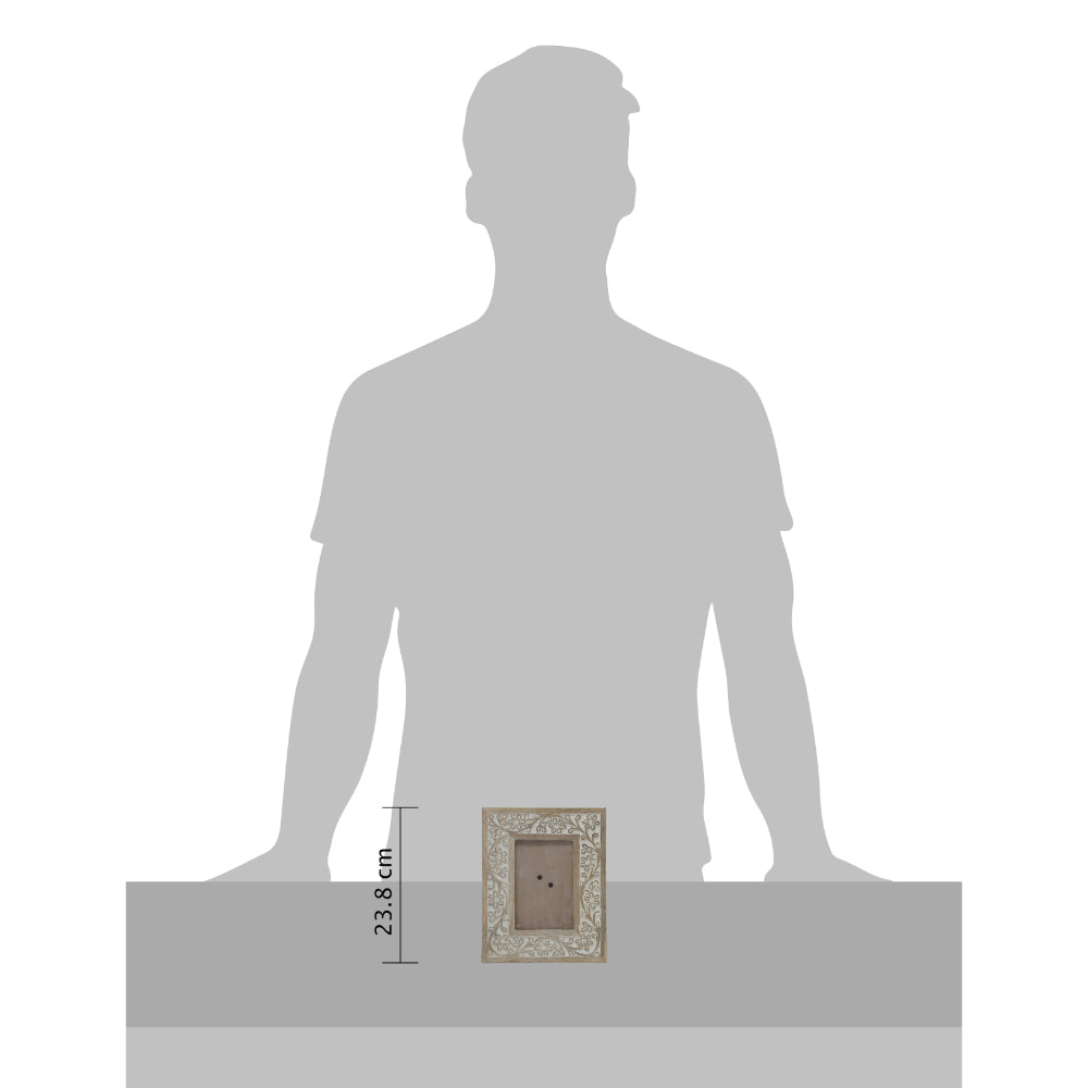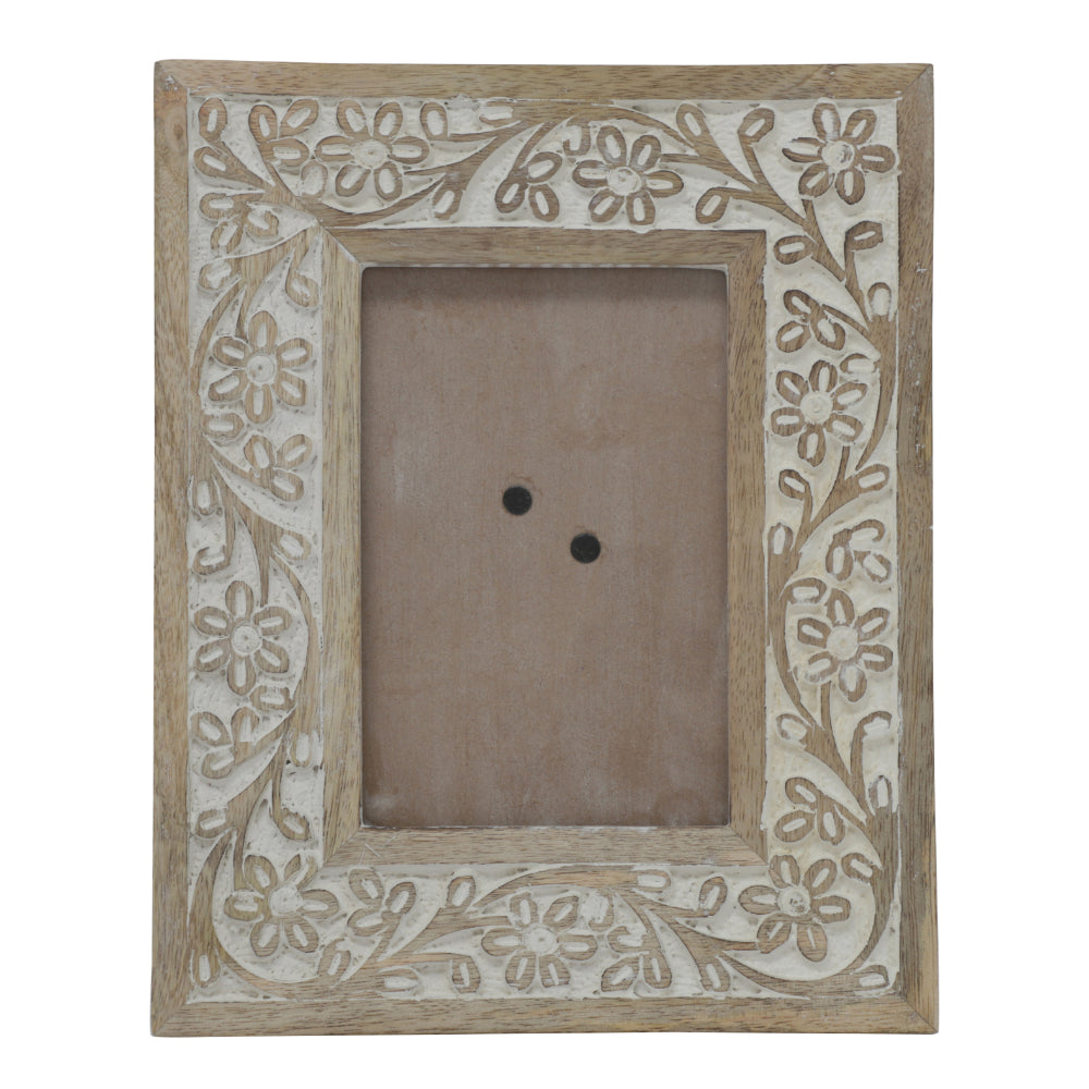Our intricately carved mango wood picture frames feature an eye-catching foliage design to really show off any special photo. This floral carved pattern in brown and white finish photoframe has been designed to hold a 4*6 inch photograph. All our beautiful frames are made from mango wood, one of the most sustainable woods known to man. Store away from heat and direct sunlight and wipe gently with damp cloth and dry immediately.