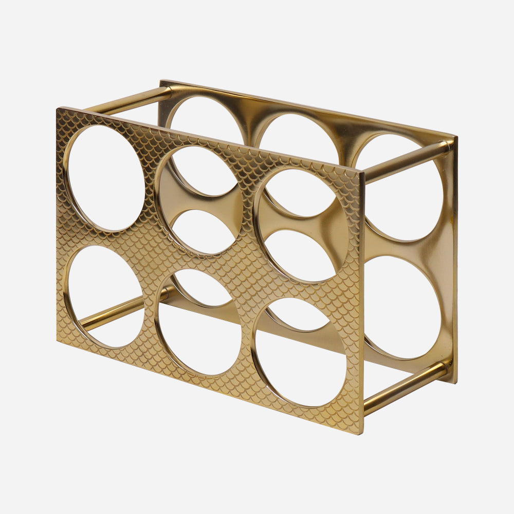 Listed is a very elegant table top wine rack. The golden rack is made of polished aluminum with etching on the outside. It is a very beautiful curved and highly polish finish . It can hold up to 6 bottles of wine. This is a handcrafted product and may have slight irregularities which only add to the charm of the finished product making it an exquisite piece.